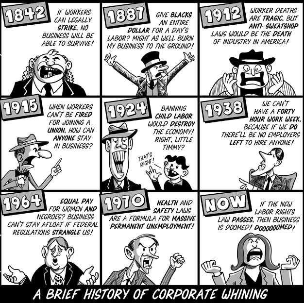 Couple other things – Let’s not forget management’s objection to an 8-hour workday. Their argument was that if you cut a 10-12 hour workday to 8, all their profits would disappear because if they had a profit margin of 10% or so, all that profit came in the last hour of the day.
