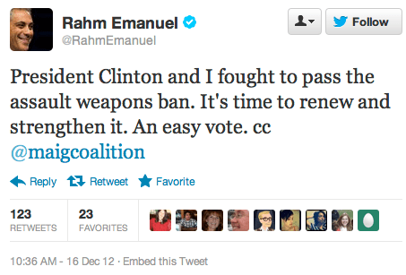 The back story on this is important. Emanuel, as a congressman who chaired the Democratic Congressional Campaign Committee (and as such helped recapture the House) came to understand that for many Democratic members of Congress is swing districts, supporting gun control was a liability. The “majority makers,” as then-Speaker Nancy Pelosi came to call them, were often from rural or blue collar districts where the NRA was active.